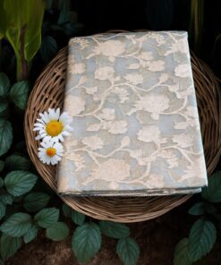 It features a serene sky blue base, adorned with handwoven floral motifs in shades of pink, green, and gold. Unlike printed designs, each motif is intricately woven using authentic handloom techniques. As a result, the craftsmanship reflects centuries-old artistry passed down by generations of skilled Banarasi weavers.