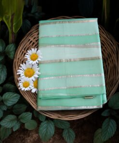 The soft aqua green hue, paired with elegantly woven silver zari diagonal stripes, adds a subtle touch of sophistication. Moreover, the lightness of the Organza silk makes it easy to drape and carry. The crisp texture, meanwhile, lends it a sense of royal grace. Each strand of silk is meticulously handwoven, ensuring a luxurious finish. Thus, the saree reflects a timeless design rooted in the centuries-old Banarasi weaving tradition.