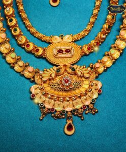 This traditional bridal necklace is an embodiment of artistry and culture. Each layer is carefully crafted to balance opulence with comfort, making it perfect for long wedding ceremonies. The warm gold tones and detailed beadwork create a harmonious design that enhances sarees, lehengas, and anarkalis alike, making it a versatile piece for various bridal looks. Its lightweight construction ensures ease of wear, while the intricate motifs reflect centuries-old craftsmanship passed down through generations. Ideal for brides seeking both grandeur and elegance, this necklace truly elevates the spirit of Indian weddings.