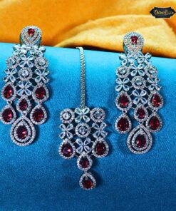Designed for the modern bride or stylish party-goer, the Red Teardrop Jewelry Collection combines timeless elegance with vibrant color. The teardrop motifs on the necklace are accented with shimmering, diamond-like stones. As a result, you’ll dazzle under every light. Moreover, the coordinating earrings and maang tika complete the look, making this set a standout in any festive wardrobe.