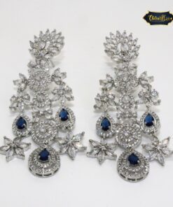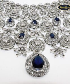 The centerpiece of this floral necklace set is its captivating necklace. It beautifully frames your décolletage with its intricate teardrop elements and delicate floral motifs. Each stone, precisely set, catches the light, creating a mesmerizing sparkle. The ornate patterns draw inspiration from blooming gardens and classic royal aesthetics. This gives the jewelry ensemble a luxurious and grand feel. Complementing the necklace, the matching earrings echo the same dazzling teardrop and floral design. They delicately frame your face, enhancing your natural glow. This matching jewelry set ensures a cohesive and stunning look.