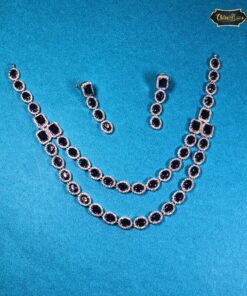 This double chain blue necklace set combines delicate craftsmanship with a modern aesthetic. In addition, the layered chains are adorned with carefully placed embellishments, leading to a large, oval-shaped royal blue stone that commands admiration. Paired with matching drop earrings, this set is perfect for fashion-forward women who appreciate detailed elegance and timeless beauty.